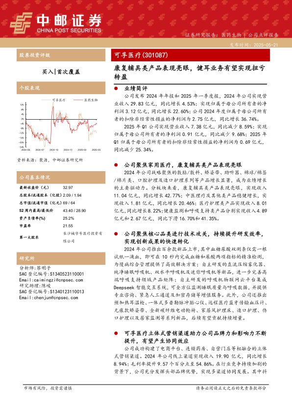 本报告对可孚医疗进行了深入分析,指出公司在2024年取得了显著的业绩增长,尤其在康复辅具类产品方面表现突出,成为核心增长动力。尽管2025年第一季度业绩短期承压,但公司通过持续的技术创新和新品研发,不断丰富产品矩阵,特别是在高端呼吸支持和慢病管理领域取得了重要进展。在营销方面,可孚医疗构建了线上线下相结合的立体式渠道,线上业务实现高速增长和毛利率提升,海外市场也展现出巨大潜力。
