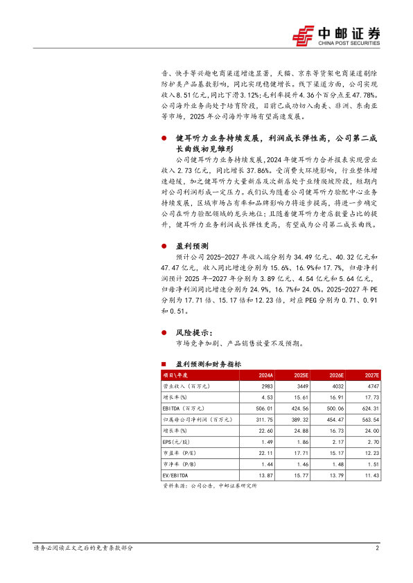 公司健耳听力业务持续发展,2024年健耳听力合并报表实现营业收入2.73亿元,同比增长37.86%。受消费大环境影响,行业整体增速趋缓,加之健耳听力大量新店及次新店处于业绩爬坡阶段,短期内对公司利润形成一定压力。我们认为随着公司健耳听力验配中心业务持续发展,区域市场占有率和品牌影响力将逐步提高,将进一步确定公司在听力验配领域的龙头地位;且随着健耳听力老店数量占比的提升,健耳听力业务利润成长弹性更高,有望成为公司第二成长曲线。
