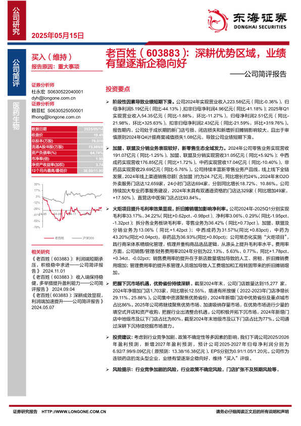本报告对老百姓(603883)公司进行了简评,核心观点如下: