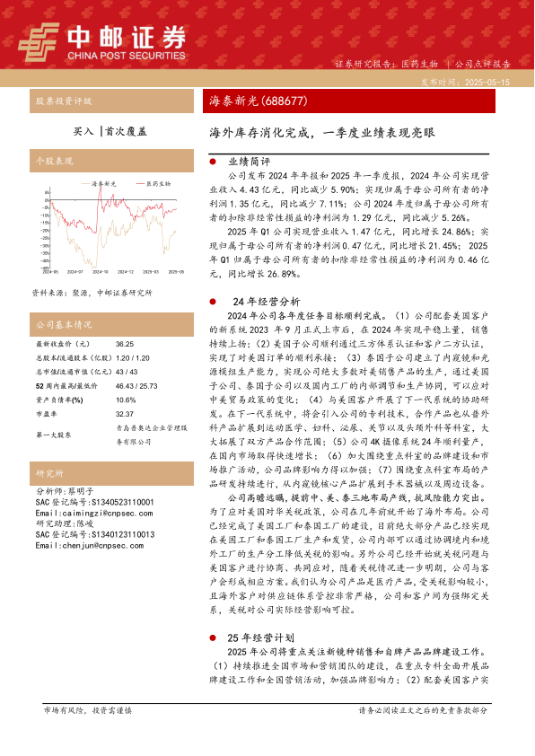 本报告核心观点指出,海泰新光在经历2024年业绩调整后,于2025年第一季度实现营收和净利润的显著增长,表现亮眼。这主要得益于公司与美国客户合作的新系统平稳上量、海外生产基地(美国和泰国子公司)的成功建设与运营,有效应对了中美贸易政策变化,并实现了对美订单的顺利承接。