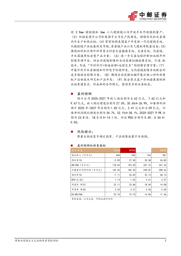 预计公司2025-2027年收入端分别为5.62亿元、7.62亿元和9.67亿元,收入同比增速分别为27.0%、35.6%和26.9%,归母净利润预计2025年-2027年分别为1.82亿元、2.41亿元和3.09亿元,归母净利润同比增速分别为34.7%,32.1%和28.1%。2025-2027年PE分别为23.8倍、18.0倍和14.1倍,对应PEG分别为0.69、0.56和0.50。