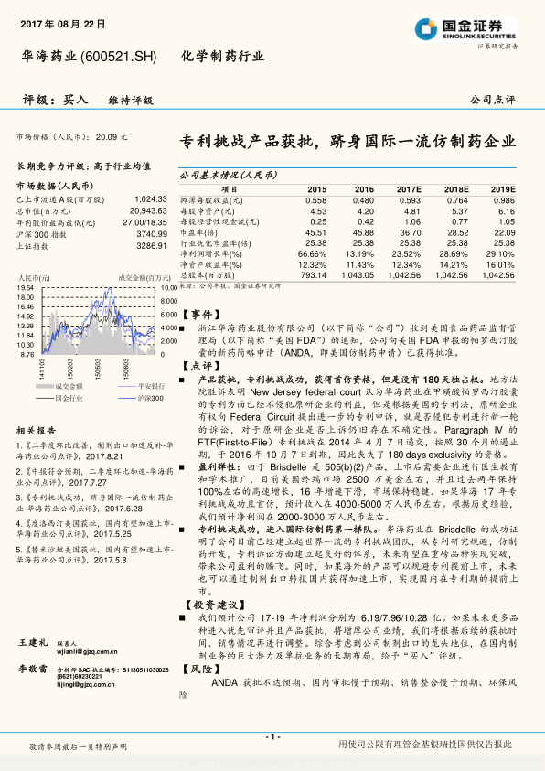 报告强调,尽管帕罗西汀胶囊此次获批未获得180天独占权,但华海药业仍面临两种战略选择,其中立即上市销售有望最大化市场份额和毛利。预计该产品将为公司带来可观的盈利弹性,初步估算年收入在4000-5000万人民币,净利润在2000-3000万人民币。结合公司在制剂出口的龙头地位、国内制剂业务的巨大潜力以及生物药领域的长期布局,报告维持对华海药业的“买入”评级,并预测2017-2019年净利润将分别达到6.19亿、7.96亿和10.28亿人民币,展现出强劲的增长潜力。