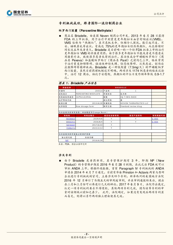 本报告核心观点指出,浙江华海药业股份有限公司(以下简称“华海药业”)成功获得美国食品药品监督管理局(FDA)批准的帕罗西汀胶囊(Brisdelle)新药简略申请(ANDA),标志着公司在专利挑战方面取得重大突破,成功跻身国际一流仿制药企业行列。此次获批不仅验证了华海药业世界一流的专利挑战团队能力,包括专利研究规避、仿制药开发和专利诉讼体系,也为其未来在重磅品种上实现突破奠定了基础。