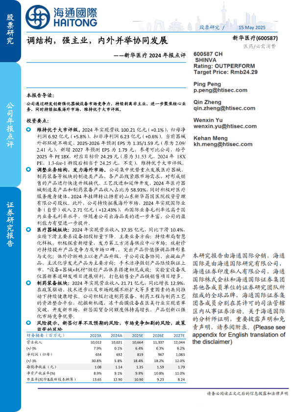 调整业务结构,发力海外市场。公司集中优势重点发展医疗器械、制药装备等板块的制造类产品,各产品线紧跟市场需求,对形成销售的产品进行快速升级换代、工艺改进和延伸开发,2024年医疗器械制造类产品和制药装备产品收入占比为58.93%,同时积极对医疗服务瘦身健体,2024年挂牌转让持有的山东新华昌国医院投资管理有限公司股权。此外,公司持续拓展海外市场,2024年实现国际业务(自营)收入2.71亿元(+12.43%),而国际业务毛利率远高于国内业务毛利率水平,伴随着公司出海品类的进一步丰富,公司的盈利能力有望进一步提升。