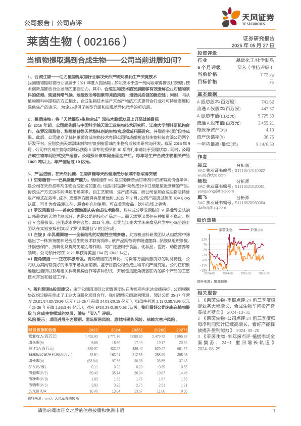 本报告分析了莱茵生物在植物提取和合成生物领域的发展战略和最新进展。公司通过“天然提取+生物合成”双技术路线,积极布局合成生物技术,并在天然代糖和生物多糖等领域取得突破。尽管公司调整了盈利预测,但仍然看好其未来发展,维持“买入”评级。