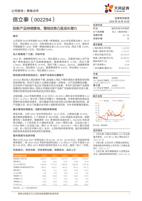 信立泰发布了2024年年报和2025年第一季度报告。2024年实现营业收入40.12亿元,同比增长19.22%,归母净利润6.02亿元,同比增长3.71%。2025年第一季度营业收入为10.62亿元,同比下降2.64%,归母净利润为2亿元,同比增长0.03%。