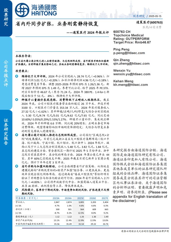 通策医疗在2024年展现了稳健的经营态势,营收和净利润均实现增长,尤其在种植牙集采背景下,通过“以量补价”策略实现了业务的逆势增长。尽管正畸业务短期承压,但公司通过深化省内“区域总院+分院”的蒲公英计划,以及创新省外“并购+轻资产加盟”的双轮驱动模式,积极拓展市场,提升运营效率。数字化中台的赋能将进一步支持其全国化网络布局。然而,公司仍需关注客单价下降、市场竞争加剧以及扩张进度不及预期等潜在风险,以确保长期可持续发展。