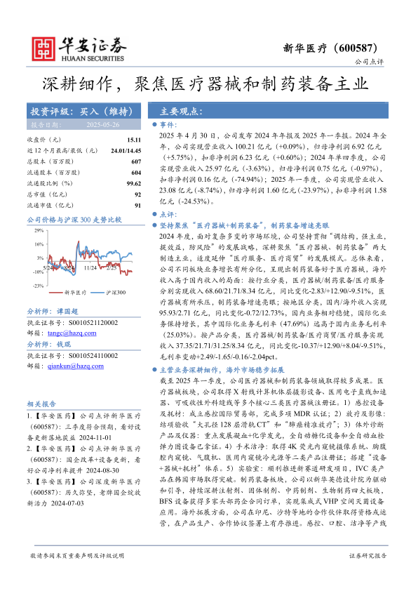 新华医疗在2024年及2025年一季度,面对市场挑战,坚持聚焦医疗器械和制药装备主业,并在海外市场取得进展。报告维持“买入”评级,看好公司未来发展。