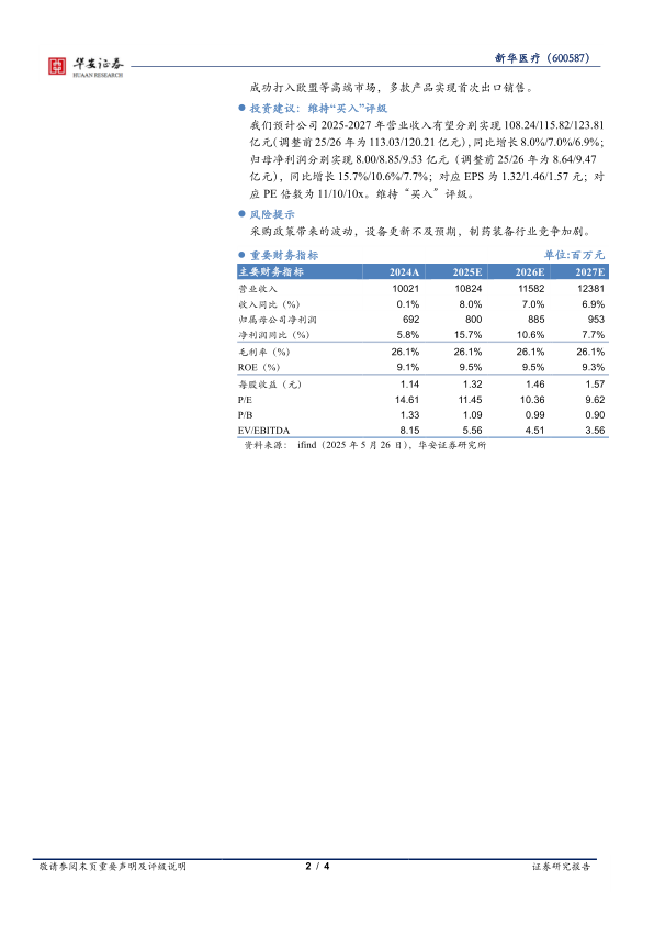 报告维持对新华医疗“买入”评级,预计公司未来几年营业收入和归母净利润将保持稳健增长。主要基于公司在医疗器械和制药装备领域的深耕细作,以及海外市场的拓展。
