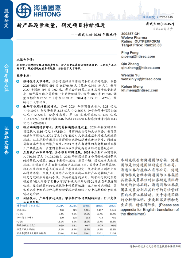 我武生物在2024年表现出稳健的经营态势,核心产品粉尘螨滴剂保持稳定增长,新产品黄花蒿粉滴剂实现快速放量,成为业绩增长的新引擎。公司在点刺液产品线和创新研发项目上持续投入并取得显著进展,产品组合日益丰富,研发管线布局长远。尽管面临产品降价、推广不及预期和行业竞争加剧等风险,但公司凭借其在过敏性疾病领域的深耕和持续创新,有望在未来保持增长势头。报告维持“优于大市”评级,并基于对新产品放量潜力的考量,给予一定的估值溢价。