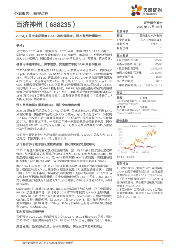 本报告分析了百济神州2025年第一季度的财务业绩,并对其未来发展进行了展望。核心观点如下: