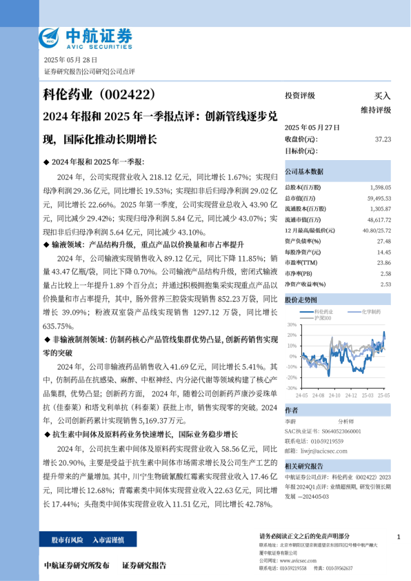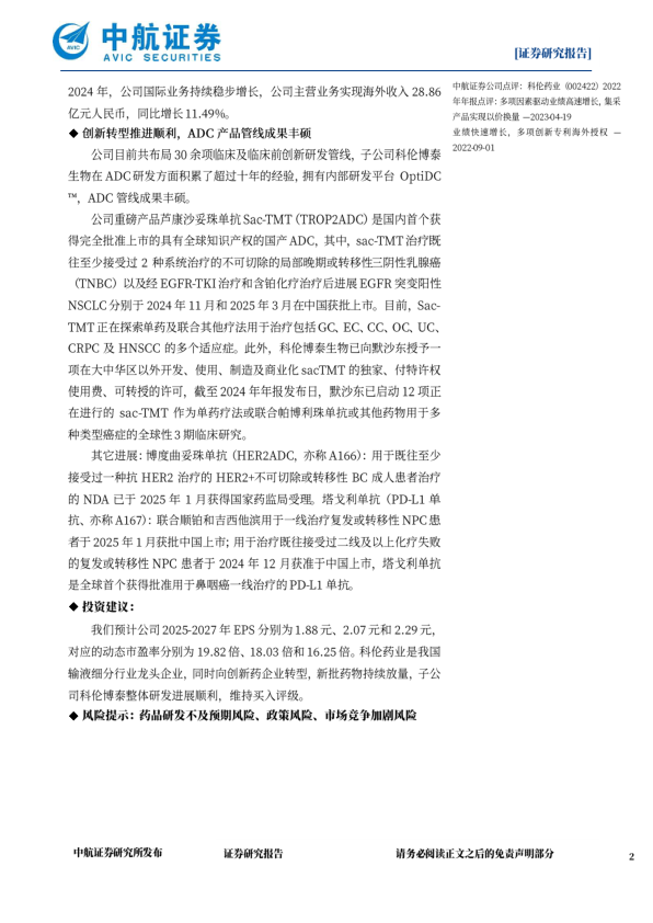 我们预计公司2025-2027年EPS分别为1.88元、2.07元和2.29元,对应的动态市盈率分别为19.82倍、18.03倍和16.25倍。科伦药业是我国输液细分行业龙头企业,同时向创新药企业转型,新批药物持续放量,子公司科伦博泰整体研发进展顺利,维持买入评级。