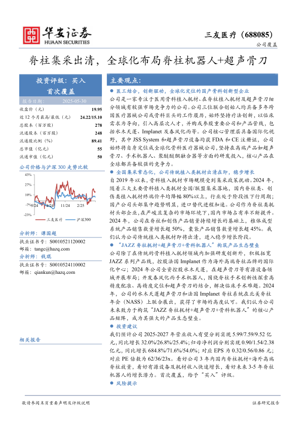 本报告通过对三友医疗的深入分析,揭示了其在骨科植入耗材领域的创新驱动和全球化战略。在集采政策影响逐渐出清的背景下,公司凭借其核心产品矩阵和市场拓展能力,有望实现业绩的快速增长。尤其看好公司在海外高端脊柱市场、有源设备及耗材以及脊柱机器人领域的增长潜力。首次覆盖,给予“买入”评级。