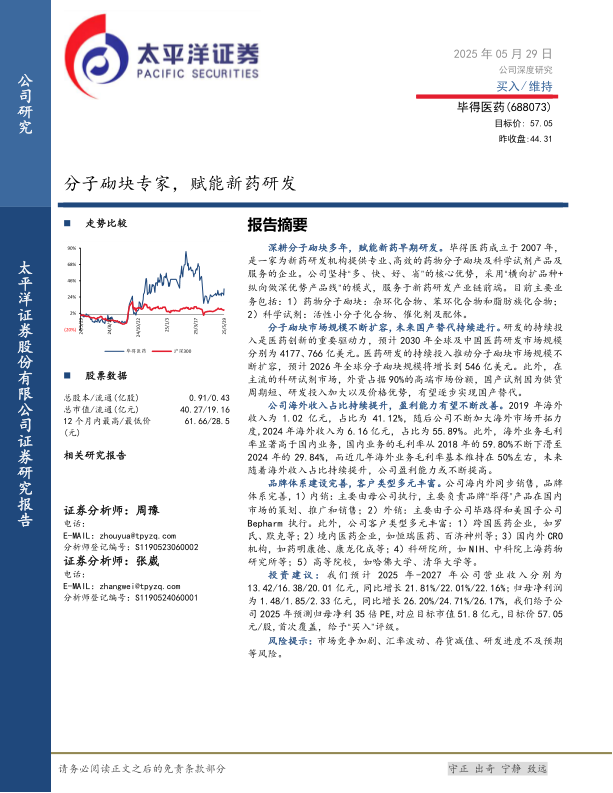 毕得医药作为新药研发前端的分子砌块专家,凭借其“多、快、好、省”的核心优势和“横向扩品种”的战略,实现了营业收入和归母净利润的快速增长。公司在分子砌块领域深耕多年,产品种类不断扩充,研发和生产能力是其核心竞争力。受益于全球医药研发投入的持续增长和分子砌块市场的扩容,以及国内科研试剂国产替代的趋势,毕得医药的市场空间广阔。公司积极推进全球化布局,海外业务占比和毛利率持续提升,有望进一步改善整体盈利能力。其完善的品牌体系和多元化的客户群体也为其长期发展奠定了坚实基础。综合来看,公司具备显著的成长性和投资价值,首次覆盖给予“买入”评级。