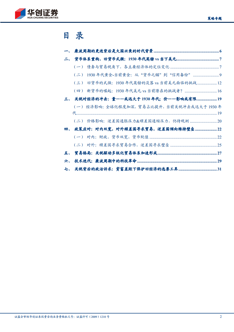 当前全球正经历货币体系重构(美元走弱、黄金升值)、关税经济冲击(量的冲击远大于1930年代,对价格影响有限)、宏观政策应对(中国双宽政策与罗斯福新政异曲同工)、贸易格局碎片化以及AI科技革命驱动下的主导国竞争。报告强调,在贫富差距加剧的背景下,关税壁垒作为保护旧经济的政治工具,其长期效果仍待观察。