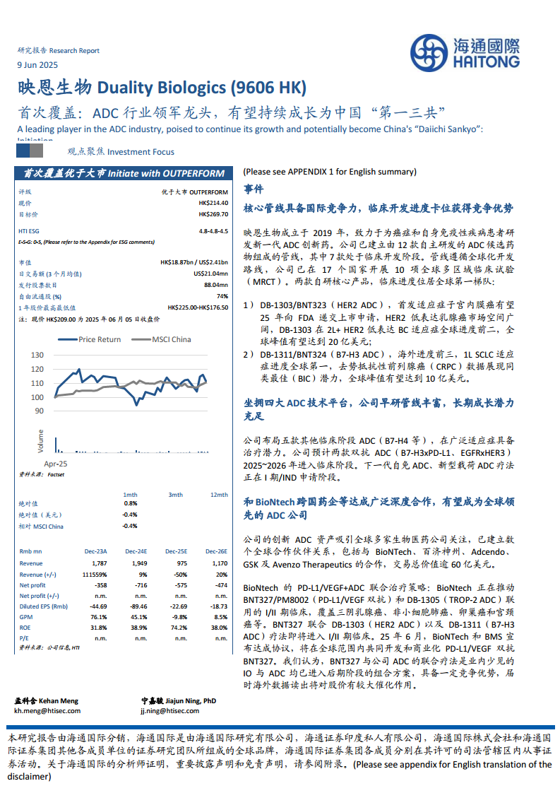 映恩生物作为ADC行业的领军龙头,凭借其全球化的创新战略、强大的技术平台、丰富的核心管线以及卓越的国际合作能力,展现出巨大的成长潜力。公司在HER2 ADC(DB-1303)、B7-H3 ADC(DB-1311)等核心产品上取得了全球领先的临床进展,并在子宫内膜癌、HER2低表达乳腺癌、小细胞肺癌和去势抵抗性前列腺癌等适应症上具备差异化竞争优势和同类最佳潜力,预计将带来可观的全球峰值销售额。同时,公司积极布局双抗ADC和自免疾病ADC等下一代创新疗法,有望解决现有治疗的耐药性问题并开拓非肿瘤市场,为公司贡献长期的业绩增长。尽管面临新药研发、市场竞争和政策等风险,但映恩生物有望持续成长为中国乃至全球领先的ADC公司,成为中国“第一三共”。