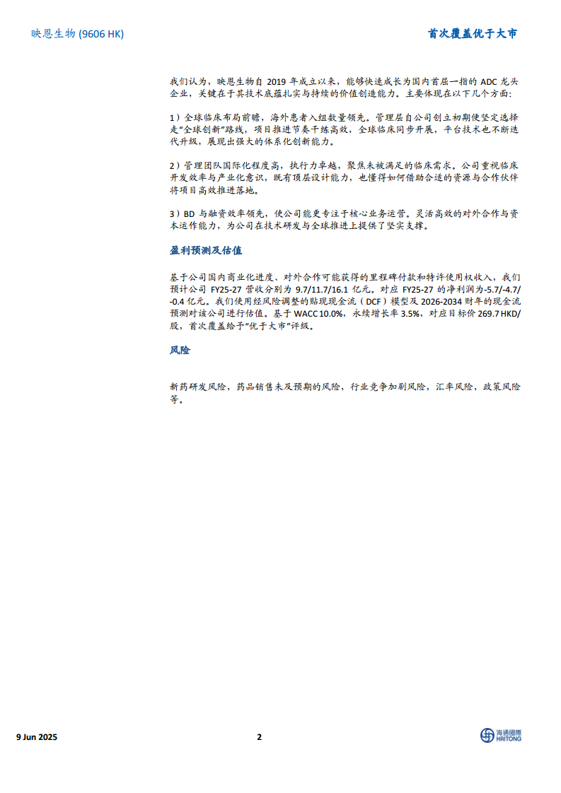 基于公司国内商业化进度、对外合作可能获得的里程碑付款和特许使用权收入,海通国际预计映恩生物FY25-27营收分别为9.7亿元、11.7亿元和16.1亿元。对应FY25-27的净利润分别为-5.7亿元、-4.7亿元和-0.4亿元。采用经风险调整的贴现现金流(DCF)模型进行估值,基于WACC 10.0%和永续增长率3.5%,目标价为269.7港元/股,首次覆盖给予“优于大市”评级。
