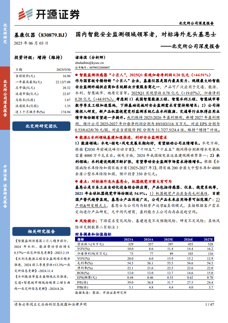 公司持续投入研发,不断迭代和创新产品,如机器视觉变形监测系统已在水利能源、交通等行业取得良好应用业绩,并获得下游客户一致好评,未来应用场景有望进一步扩大。在产销模式上,基康仪器与海外龙头基恩士(Keyence)相似,采用轻资产运营和直销模式,有助于构建高利润壁垒并精准响应客户需求。多重驱动因素共同作用下,公司业绩实现稳健增长,盈利能力持续提升,市场份额有望进一步扩大,维持“增持”评级。
