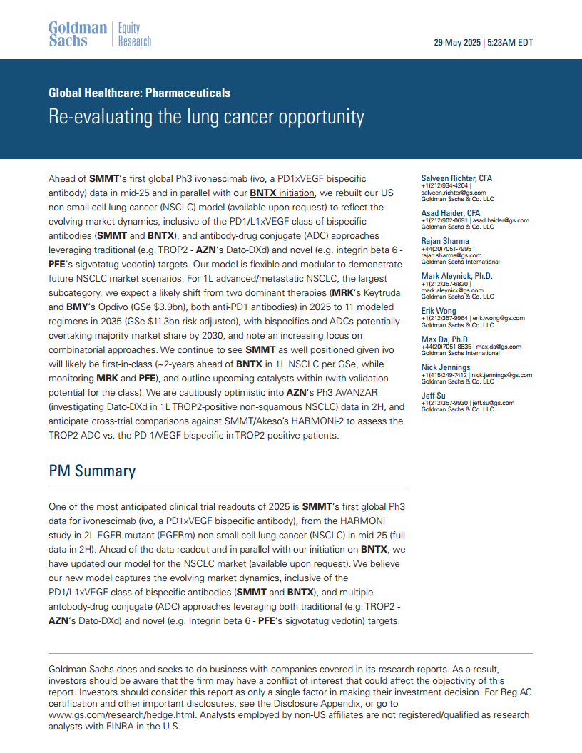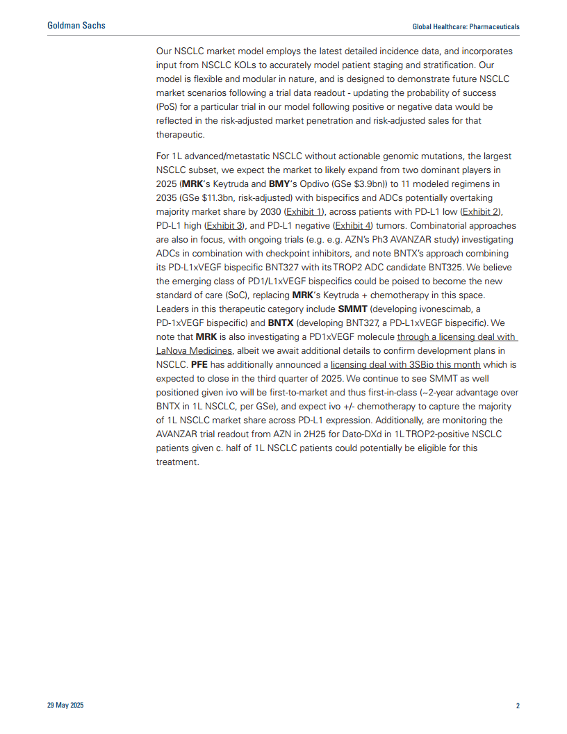 高盛重建了其全球NSCLC市场模型,以反映不断演变的市场动态,包括PD1/L1xVEGF双特异性抗体(SMMT和BNTX)和抗体偶联药物(ADCs,如AZN的Dato-DXd和PFE的sigvotatug vedotin)等新兴疗法。该模型灵活且模块化,旨在展示未来NSCLC市场情景。