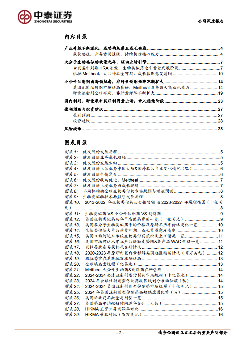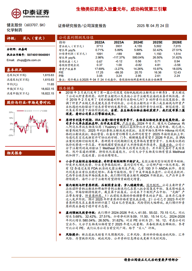 健友股份正经历深刻的产业升级,成功构筑起以大分子生物类似药为核心的“第三成长曲线”,辅以稳健增长的小分子注射剂出口业务,并伴随国内制剂和肝素原料药业务压制因素的出清,公司整体盈利能力和市场竞争力显著增强。在原研药专利集中到期和美国《通胀削减法案》(IRA法案)重构赔付机制的背景下,生物类似药市场迎来黄金发展机遇,健友股份凭借其强大的研发生产能力和Meitheal团队卓越的商业化能力,有望实现多个大品种的快速放量,成为未来业绩增长的主要驱动力。