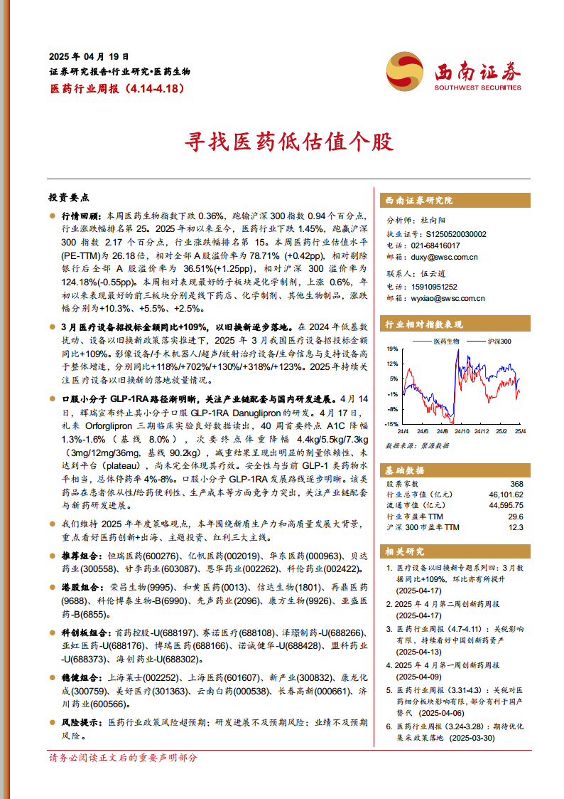 医药行业周报(4.14-4.18):寻找医药低估值个股