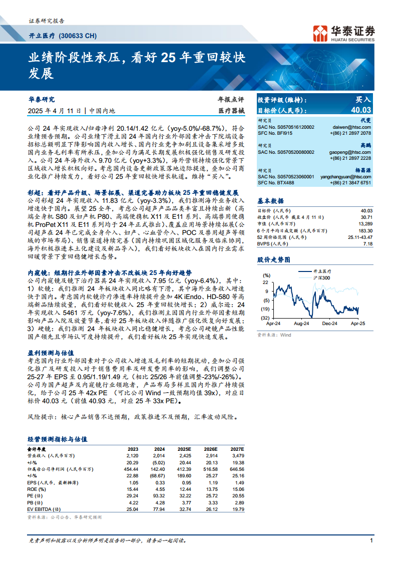 开立医疗2024年业绩因国内市场外部因素和公司战略性投入而阶段性承压,但海外业务表现积极。展望2025年,受益于国内设备更新政策、公司持续的产品创新、市场拓展和渠道优化,彩超和内窥镜两大核心业务有望重回稳健增长。华泰研究维持“买入”评级,并基于对市场环境和公司投入的最新评估,调整了盈利预测和目标价,看好公司长期发展潜力。主要风险包括核心产品销售不达预期、政策推进不及预期以及汇率波动。
