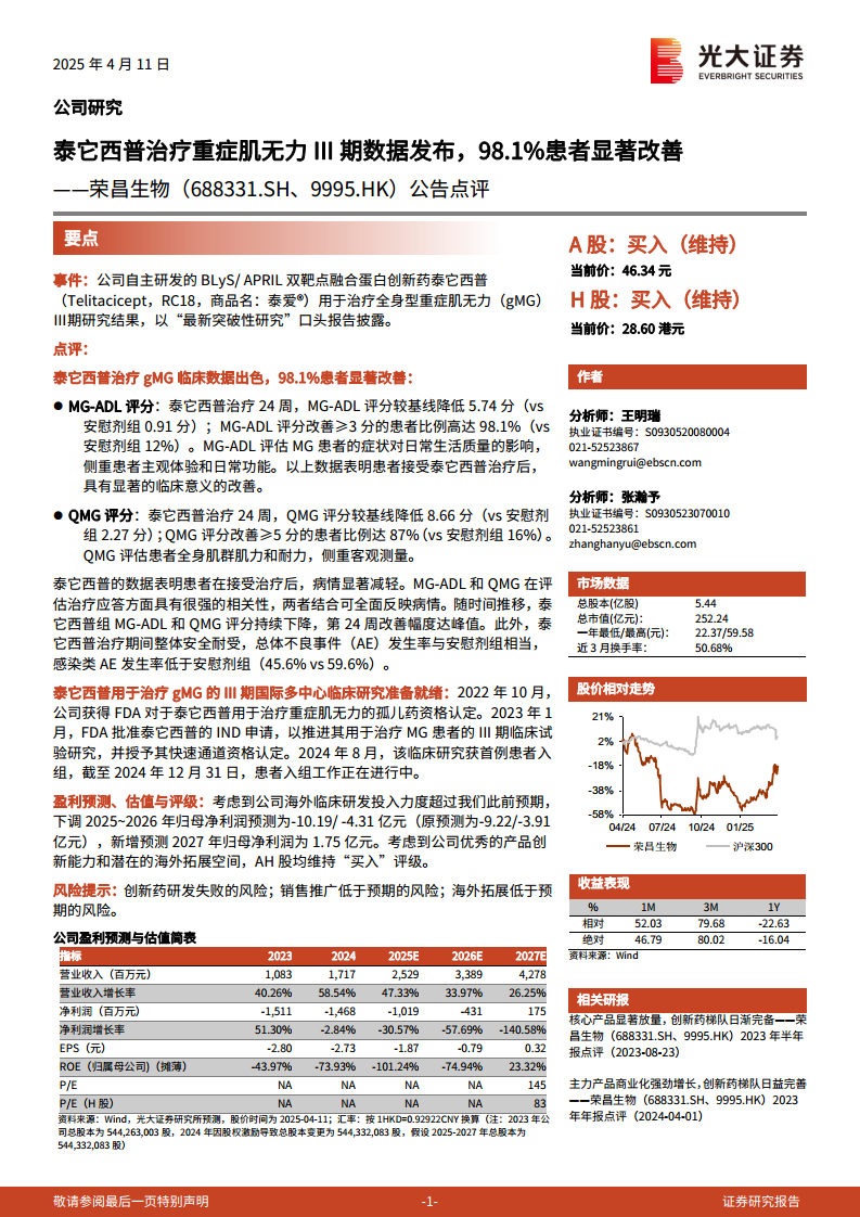 荣昌生物(688331):公告点评:泰它西普治疗重症肌无力III期数据发布,98.1%患者显著改善