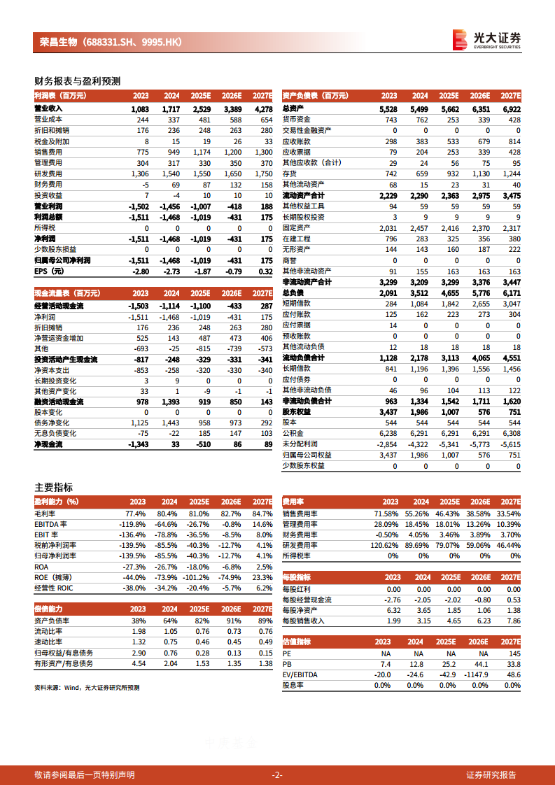 公司的净利润在短期内仍将处于亏损状态,主要受高额研发投入的影响。2023年净利润为-1,511百万元,2024年为-1,468百万元。根据最新预测,2025年和2026年净利润预计分别为-1,019百万元和-431百万元,亏损幅度逐年收窄。值得注意的是,报告预测2027年净利润将转正,达到175百万元,净利润增长率高达-140.58%(从负转正)。这预示着公司在经历高投入期后,有望凭借创新药的商业化成功实现盈利。