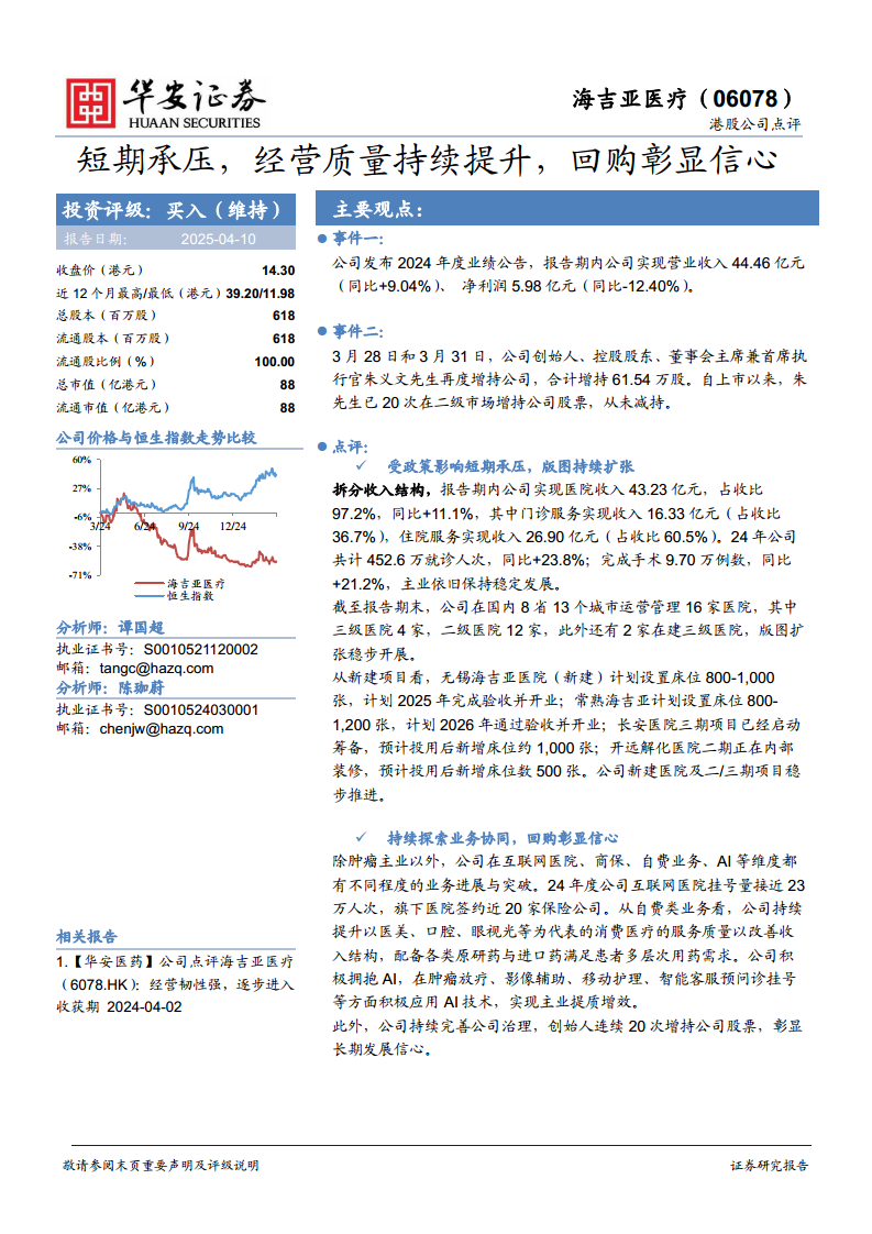 海吉亚医疗在2024年虽然面临短期业绩压力,归母净利润有所下滑,但其核心医院业务收入仍保持稳健增长,就诊人次和手术例数均实现两位数增长,展现出强大的经营韧性。公司通过持续的医院网络扩张,多个新建及扩建项目稳步推进,为未来增长奠定基础。同时,公司积极拓展互联网医疗、商业保险、自费业务及AI技术应用,探索多元化增长路径。创始人持续增持公司股票,彰显了管理层对公司长期发展的坚定信心。尽管短期承压,但基于其稳健的经营、清晰的扩张战略和优化的财务结构,华安证券维持“买入”评级,并预计公司未来几年营收和净利润将恢复增长。投资者应关注政策变化、人才留存、区域运营及行业竞争等潜在风险。