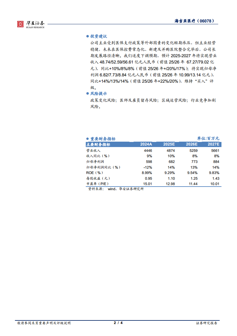 尽管海吉亚医疗主业短期受到医保支付政策等外部因素影响,但其经营保持稳健。随着医保控费常态化以及新建及并购医院的逐步整合完毕,公司长期发展路径清晰。基于此,华安证券适度下调了对公司的盈利预期,预计2025-2027年将实现营业收入分别为48.74亿元、52.59亿元和56.61亿元人民币,同比增速分别为10%、8%和8%。同期,归母净利润预计分别为6.82亿元、7.73亿元和8.84亿元人民币,同比增速分别为14%、13%和14%。鉴于公司稳健的经营和清晰的长期发展战略,华安证券维持“买入”评级。