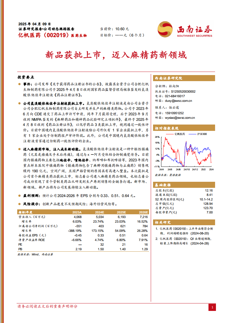 该新品的获批上市,使亿帆医药成为中国境内首家通过仿制药一致性评价的企业,并实现了管制类药品从研发到生产再到销售的全链条打通,确立了其在该领域的先发优势。分析师预计,公司2024-2026年归母净利润将实现显著增长,EPS分别为0.33元、0.51元、0.64元,展现出强劲的盈利增长潜力。