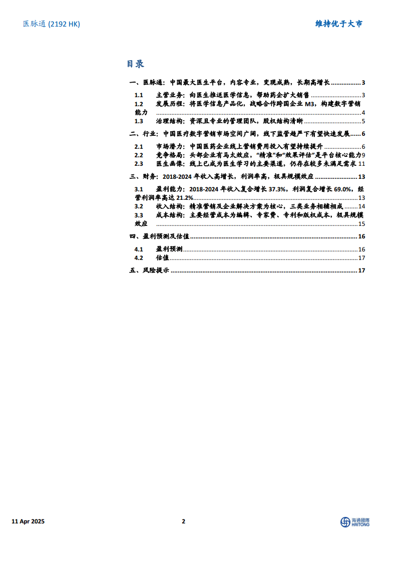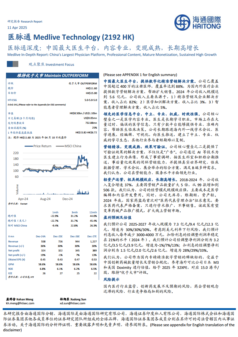 医脉通作为中国最大的医生平台,凭借其广泛的医生覆盖、专业的医学内容、成熟的数字化精准营销解决方案以及前瞻性的AI技术应用,在医药行业监管趋严和数字营销市场扩容的背景下,展现出强大的增长潜力和竞争优势。公司财务表现稳健,收入和利润持续高增长,且具备显著的规模效应。尽管面临行业监管、创新药发展不及预期、药企营销观念迟滞及市场竞争加剧等风险,但其独特的市场地位和业务模式使其有望持续受益于中国医疗数字营销市场的结构性机遇。报告维持“优于大市”评级,并给出15.0港币/股的目标价,反映了对其未来业绩增长的积极预期。