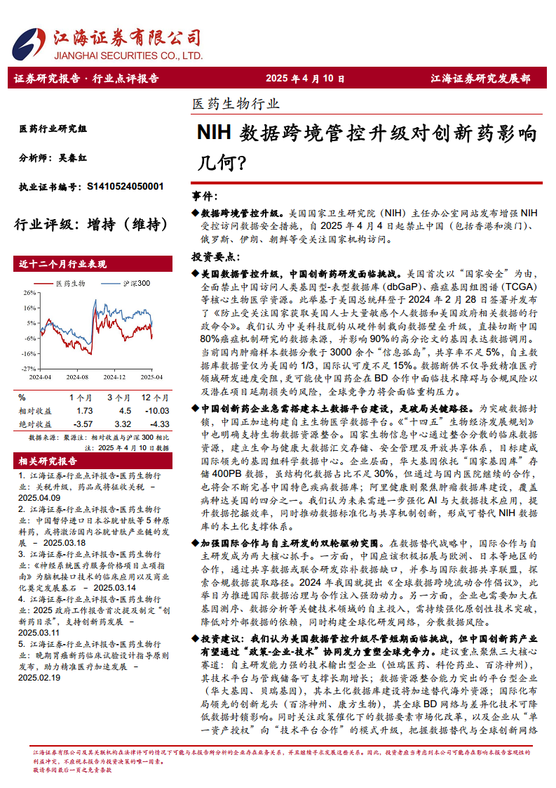 医药生物行业:NIH数据跨境管控升级对创新药影响几何?