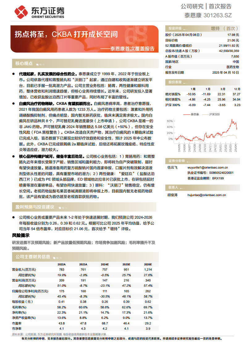 泰恩康正处于业务转型的关键时期,通过持续的研发投入和产品线拓展,展现出显著的成长潜力。公司在白癜风治疗领域布局的全球首创分子CKBA,有望填补巨大的临床未满足需求,成为未来业绩增长的核心驱动力。同时,核心产品如“和胃整肠丸”的自产化将打破产能和区域限制,显著提升盈利能力;两性健康领域的“爱廷玖”已建立品牌优势,并有丰富管线协同发展;眼科领域的“沃丽汀”销售稳定,而老视药物盐酸毛果芸香碱滴眼液有望抢占国内市场空白。尽管面临研发、市场竞争等风险,但公司核心业务的快速进展和丰富的产品储备,预示着其拐点将至,成长空间广阔。
