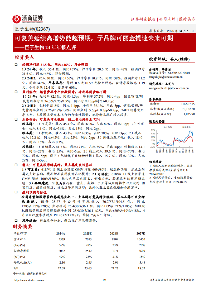 巨子生物在2024年展现出强劲的业绩增长势头,经调整归母净利润同比增长46%,超出市场预期。这主要得益于其核心品牌可复美和子品牌可丽金的卓越表现,尤其是在线上渠道的显著优势。公司在保持高毛利率的同时,积极拓展线下渠道,并通过产品创新和品牌建设巩固了市场地位。尽管面临销售费用率上升等挑战,但作为重组胶原蛋白赛道的领军企业,巨子生物的未来增长潜力依然显著。基于对公司未来收入和利润的积极预测,维持“买入”评级。