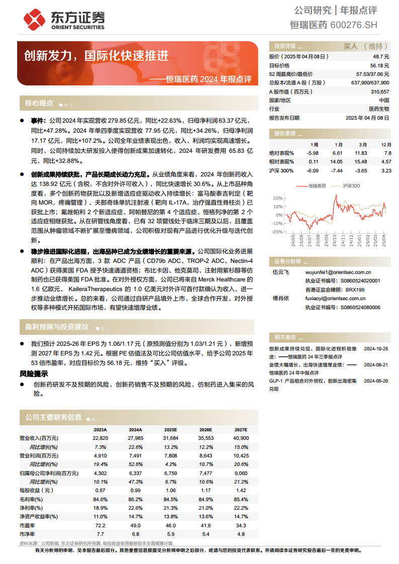 盈利预测与投资建议: 基于公司强劲的业绩表现和清晰的增长路径,东方证券研究所对恒瑞医药的盈利预测进行了调整。预计2025-2027年每股收益(EPS)分别为1.06元、1.17元和1.42元,相较于之前的预测值有所优化,并新增了2027年的预测数据,显示出分析师对公司未来盈利能力的信心。根据PE估值法及可比公司估值水平,分析师给予公司2025年53倍市盈率,对应目标价为56.18元。鉴于公司在创新研发和国际化方面的显著进展,以及未来业绩的增长潜力,维持“买入”评级。当前股价为48.7元,目标价存在15.36%的上涨空间。