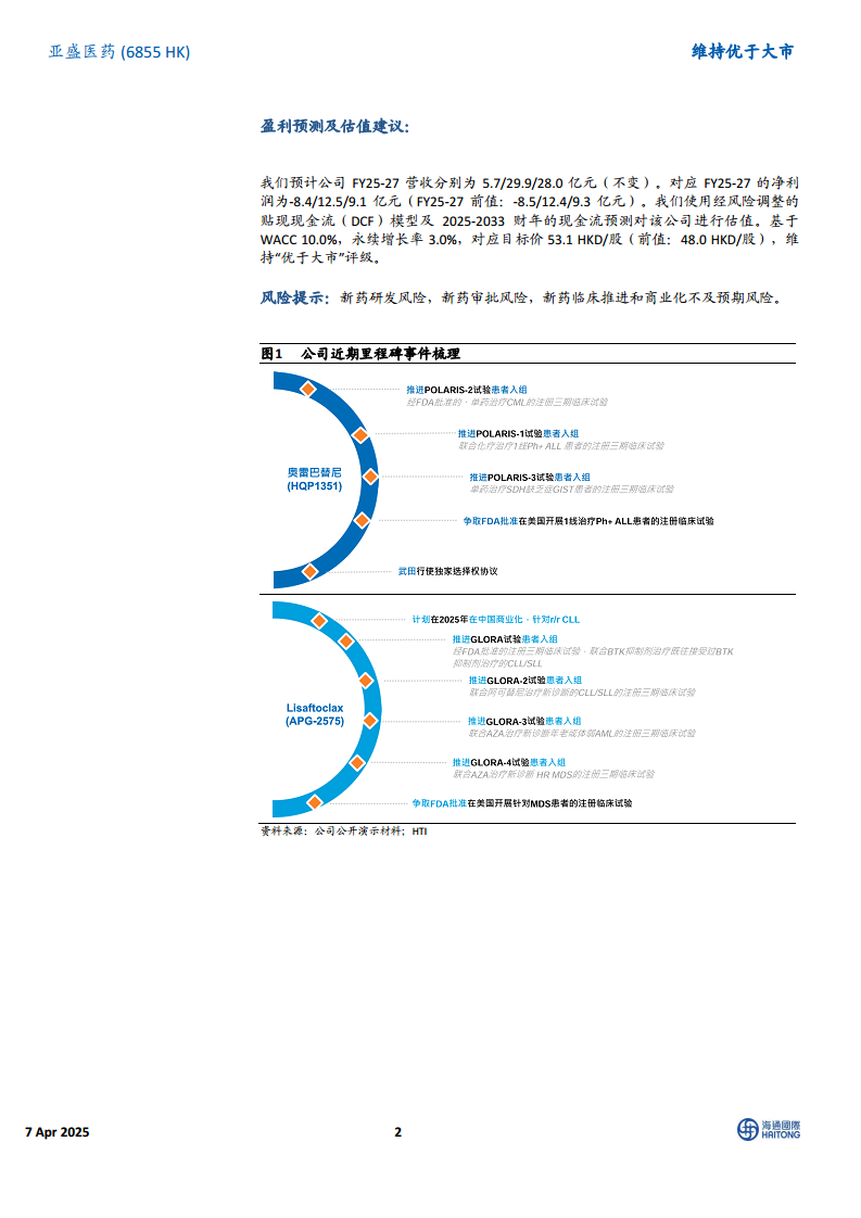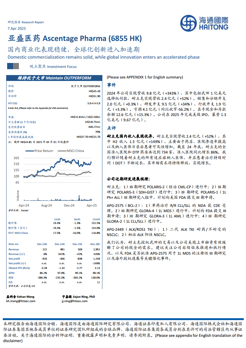 亚盛医药在2024年展现出强劲的增长势头,营收同比大增343%,主要得益于核心产品耐立克在国内市场的优异表现和与武田的授权交易。耐立克通过提升医院和药店渗透率以及纳入医保目录,实现了52%的营收增长,并在下半年加速放量。公司研发管线丰富,多款产品如耐立克和APG-2575在全球范围内进入关键临床阶段,其中APG-2575的NDA已获CDE受理,并计划向FDA提交多项III期申请,预示着全球化创新进入加速期。美股IPO的成功募资进一步增强了公司的财务实力。尽管2025年营收预计有所波动,但随着产品管线的持续推进和商业化进程的深化,公司预计将在2026年实现盈利,并迎来业绩的爆发式增长。海通国际维持“优于大市”评级,并将目标价上调至53.1港元/股,但投资者仍需关注新药研发、审批及商业化不及预期等风险。