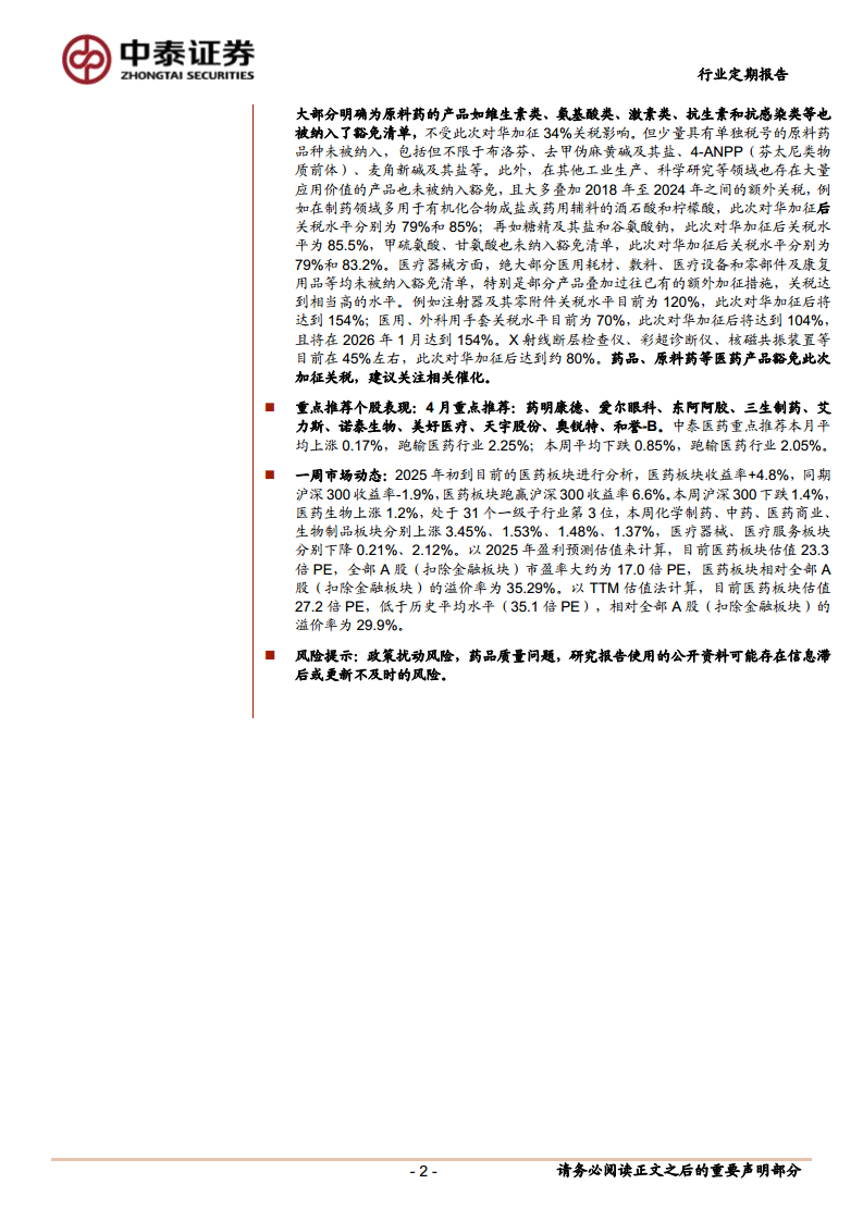 报告建议关注药品、原料药等医药产品豁免此次加征关税带来的相关催化效应。