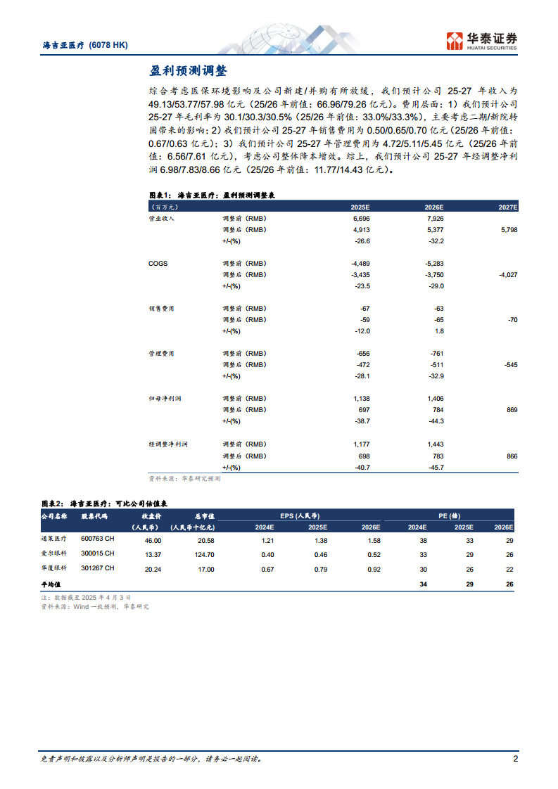 综合考虑医保环境影响及公司新建/并购速度放缓,华泰研究下调了公司2025-2027年收入预测至49.13/53.77/57.98亿元人民币(原预测2025/2026年为66.96/79.26亿元人民币)。相应地,2025-2027年经调整净利润预测下调至6.98/7.83/8.66亿元人民币(原预测2025/2026年为11.77/14.43亿元人民币)。