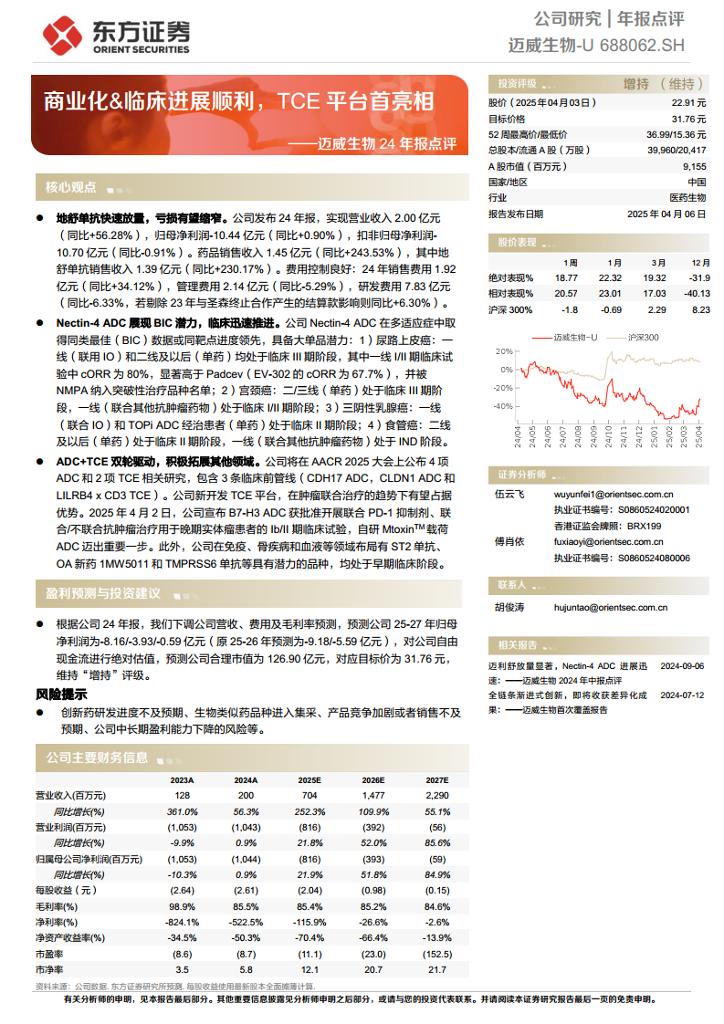 鉴于公司商业化进展顺利、核心管线潜力巨大以及未来亏损有望持续收窄,东方证券维持对迈威生物-U的“增持”评级。