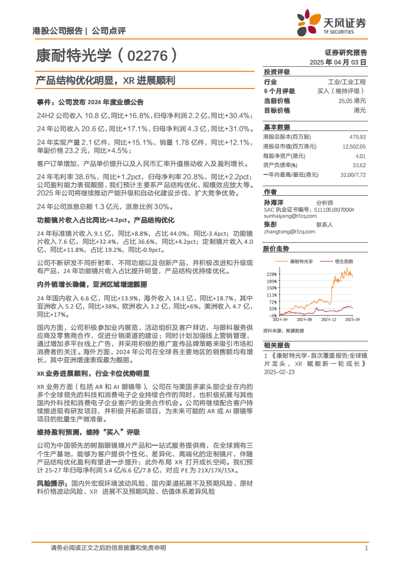 鉴于公司作为中国领先的树脂眼镜镜片产品和一站式服务提供商,在全球拥有三个生产基地,能够提供个性化、差异化、高端化的定制镜片,且伴随产品结构优化盈利有望进一步提升,同时XR业务布局打开成长空间,分析师维持盈利预测,并维持“买入”评级。预计2025-2027年归母净利润分别为5.4亿、6.6亿和7.8亿港元,对应PE分别为21X、17X和15X。同时,报告提示了国内外宏观环境波动风险、国内渠道拓展不及预期风险、原材料价格波动风险、XR进展不及预期风险以及估值体系差异风险。