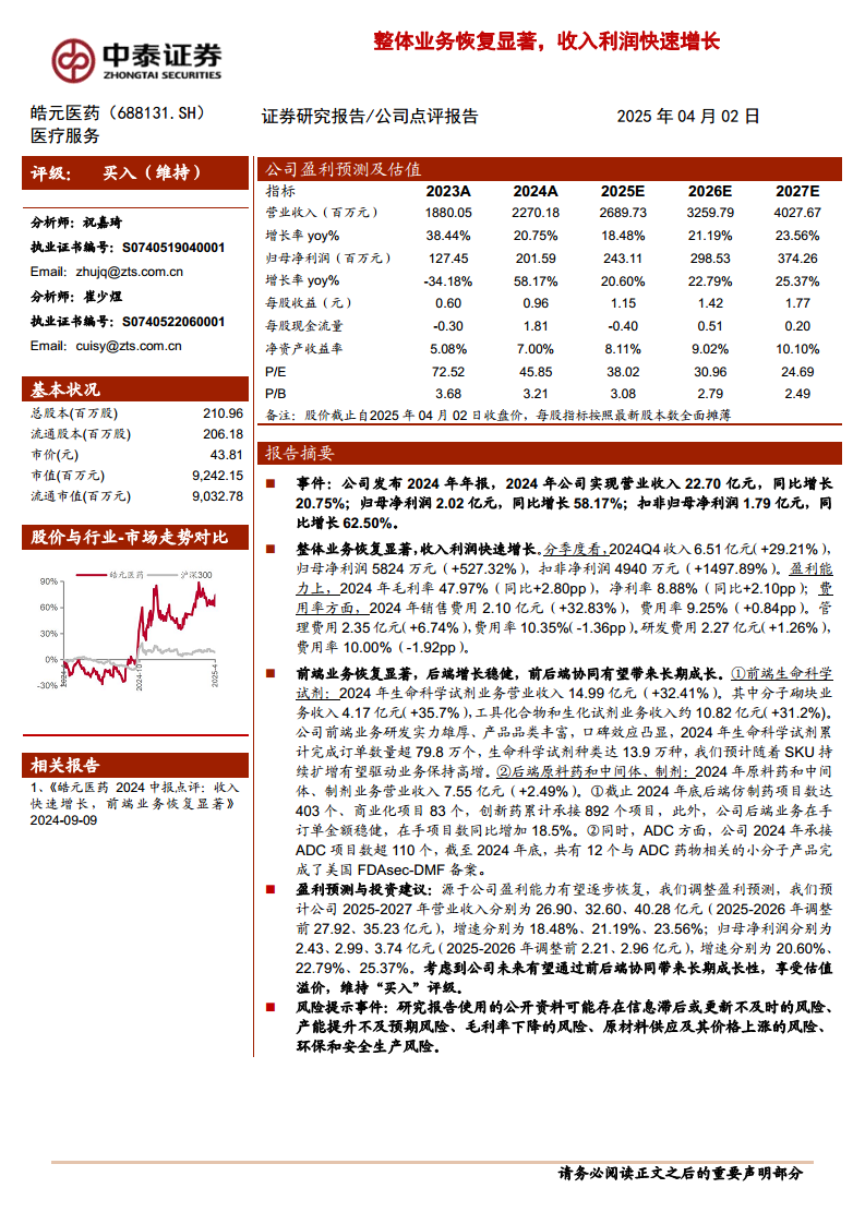 皓元医药在2024年展现出强劲的业务恢复和快速增长态势,营业收入和归母净利润均实现显著增长,特别是第四季度业绩表现亮眼。公司盈利能力显著提升,毛利率和净利率均有所改善,费用结构趋于优化。业务层面,前端生命科学试剂业务凭借丰富的产品种类和庞大的订单量实现高速增长,后端原料药、中间体及制剂业务则通过持续的项目积累和在ADC等新兴领域的布局保持稳健发展。中泰证券基于公司盈利能力恢复和前后端业务协同带来的长期成长性,调整了未来三年的财务预测,并维持“买入”评级。然而,投资者仍需关注信息滞后、产能提升不及预期、毛利率下降、原材料供应及价格波动以及环保和安全生产等潜在风险。