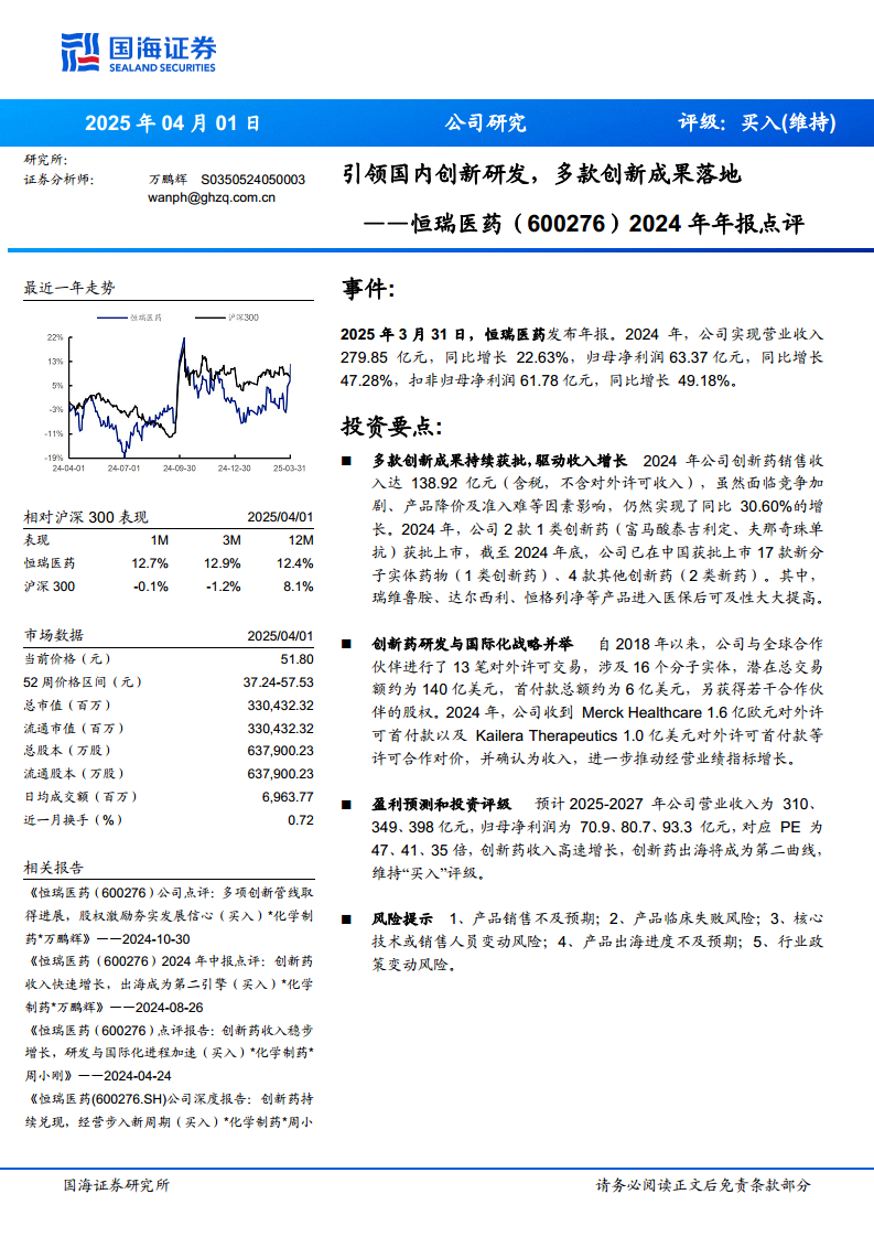 恒瑞医药在2024年凭借其卓越的创新研发能力和前瞻性的国际化战略,实现了营业收入和归母净利润的显著增长,分别达到279.85亿元和63.37亿元,同比增幅分别为22.63%和47.28%。创新药销售收入贡献了138.92亿元,同比增长30.60%,是业绩增长的核心动力。同时,公司通过多项对外许可交易,如2024年收到的Merck Healthcare和Kailera Therapeutics的首付款,有效推动了国际化进程并带来了可观的收入。展望未来,国海证券预计公司营收和净利润将持续增长,并维持“买入”评级,认为创新药的高速增长和国际化战略将成为公司业绩持续提升的“第二曲线”。然而,投资者仍需警惕产品销售、临床研发、人才变动及行业政策等潜在风险。