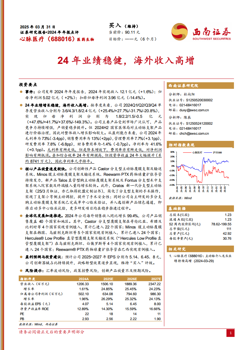 心脉医疗在2024年展现了稳健的经营韧性,尽管面临国家医保局价格治理的挑战,但通过核心产品的持续创新和全球化战略的深入推进,实现了业绩的平稳增长,特别是海外市场表现亮眼。公司在主动脉介入和外周产品领域的研发投入和市场拓展,为其未来增长奠定了坚实基础。预计未来几年,随着创新器械占比的提升和全球化布局的深化,公司业绩有望持续增长,维持“买入”评级。投资者需关注汇率波动、政策控费及创新产品放量不及预期等潜在风险。