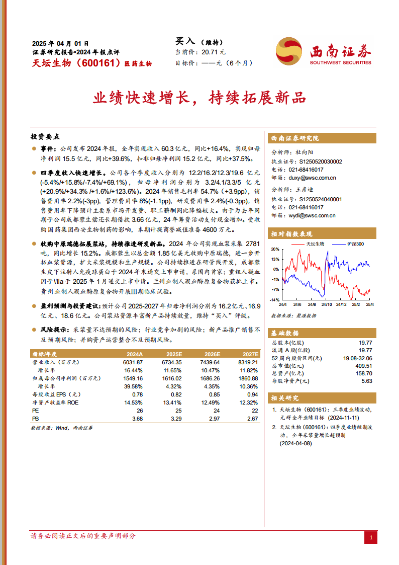 天坛生物在2024年展现了强劲的业绩增长势头,营业收入和归母净利润均实现双位数高增长,尤其第四季度表现突出。公司通过战略性收购中原瑞德,有效拓展了血浆资源,为血液制品业务的持续发展提供了坚实保障。同时,多款创新产品如皮下注射人免疫球蛋白和重组人凝血因子Ⅶa的研发进展和上市申请,预示着公司在产品结构优化和市场竞争力提升方面取得了重要突破。尽管面临采浆量、市场竞争和新产品推广等潜在风险,但基于其丰富的浆站资源、不断丰富的产品管线以及稳健的财务表现,公司预计未来几年将保持持续的盈利增长。西南证券维持“买入”评级,体现了对公司长期发展潜力的积极认可。