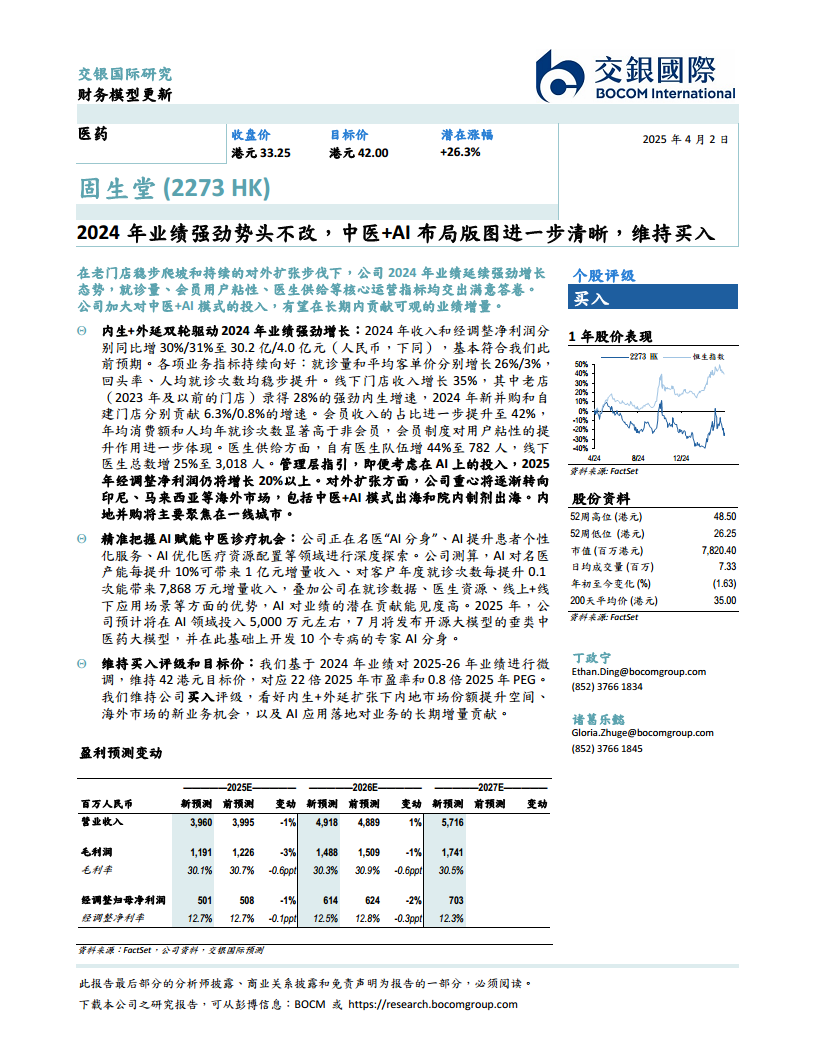 固生堂在2024年凭借其“内生+外延”双轮驱动的扩张战略,实现了强劲的业绩增长,并在就诊量、会员粘性及医生供给等核心运营指标上取得了显著进步。公司前瞻性地布局“中医+AI”模式,通过名医AI分身、个性化服务和资源优化等应用场景,有望在长期内带来可观的增量收入,并进一步提升其在医疗服务领域的竞争力。尽管对未来盈利预测进行了微调,交银国际仍维持固生堂“买入”评级和42港元的目标价,充分肯定了公司在内地市场份额提升、海外业务拓展以及AI技术应用方面的长期增长潜力。固生堂的财务状况稳健,现金流充裕,为未来的持续发展奠定了坚实基础。