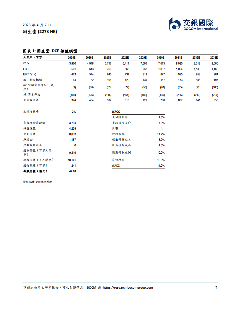 DCF估值模型显示,在永续增长率2%和加权平均资本成本(WACC)11.0%的假设下,固生堂的企业价值为8,033百万元人民币,股权价值为9,219百万元人民币(折合10,141百万港元),对应每股价值42.00港元。WACC的计算基于4.0%的无风险利率、7.0%的市场风险溢价、1.1的贝塔值、11.7%的股权成本、5.0%的税前债务成本、4.3%的税后债务成本、10.0%的预期债权比例和15.0%的有效税率。
