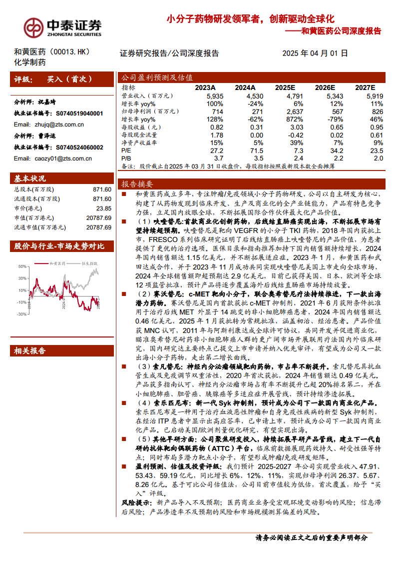 报告强调了和黄医药核心产品(如呋喹替尼、赛沃替尼、索