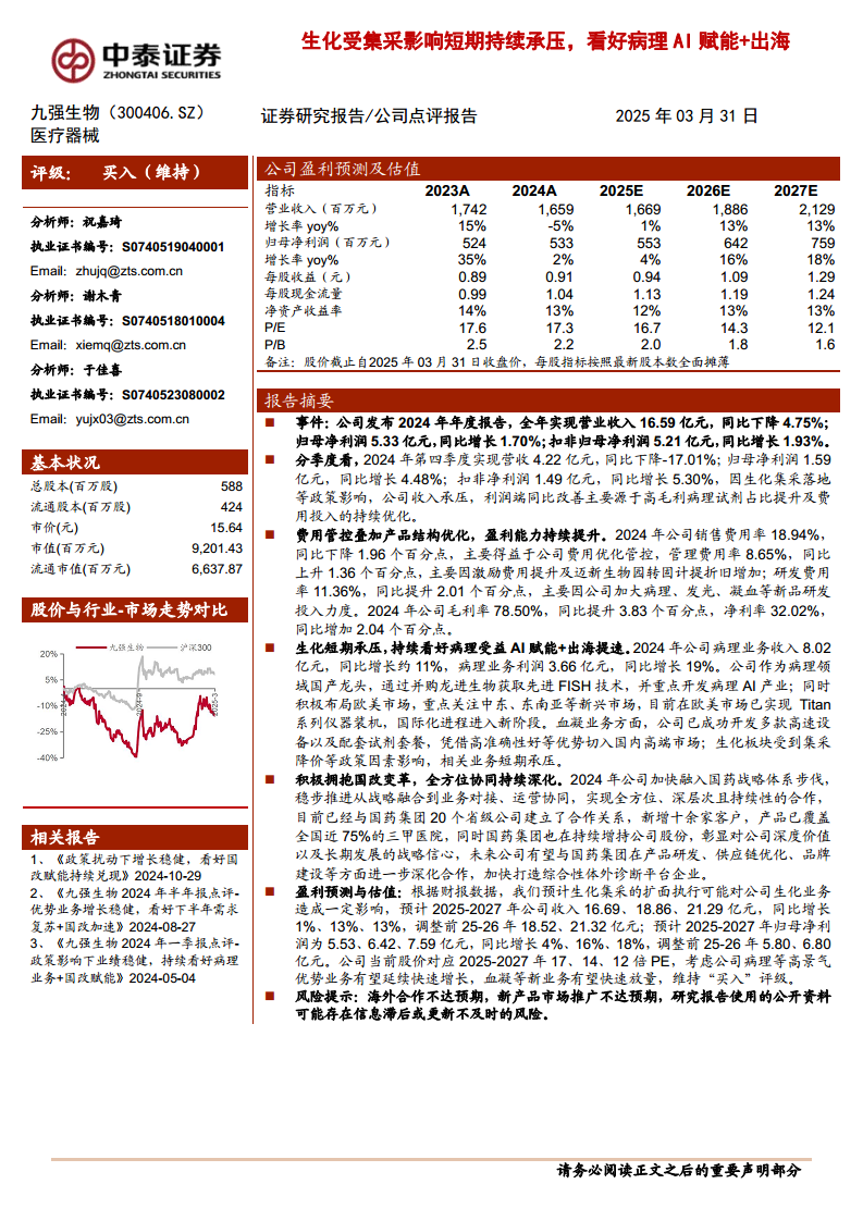 九强生物在2024年面临生化集采带来的短期营收压力,但通过精细化费用管控和高毛利病理业务的强劲增长,实现了归母净利润的稳健提升。公司在病理领域积极布局AI技术和国际市场,展现出明确的增长路径。同时,与国药集团的深度战略协同为公司带来了广阔的市场覆盖和未来发展潜力。尽管短期内生化业务承压,但病理、血凝等优势业务的驱动以及国改的赋能,使得公司具备持续增长的动力。基于对未来盈利能力的积极预期,分析师维持“买入”评级。