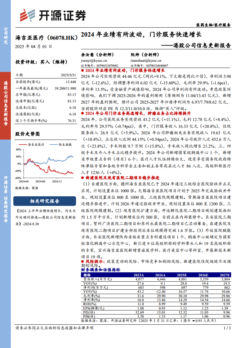 海吉亚医疗在2024年虽然受到金融资产减值影响导致净利润波动,但其核心业务表现强劲,特别是门诊服务收入实现20.8%的高速增长,肿瘤相关业务占比持续提升至44.15%。公司积极推进医院网络扩张,多个新建及扩建项目稳步进行,预计未来床位规模将大幅增加。尽管分析师下调了盈利预测以反映政策环境影响,但鉴于公司在医疗服务能力提升和市场扩张方面的持续努力,维持“买入”评级,表明对其长期增长潜力的信心。投资者需关注政策变动、市场竞争及新医院运营爬坡等潜在风险。